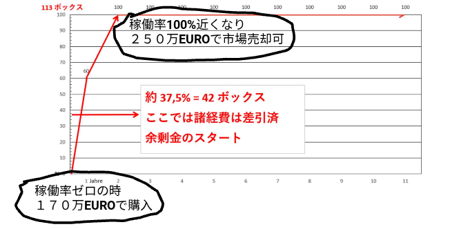 ・オープン2〜3年後、トランクルームの稼働率100%近くになった時点で、約250万ユーロでマーケットで売却可能になります。80万ユーロの売却益を手にしていただくか、(対取得価格費)7%超のネット利回りで運用するかは自由に選べます。