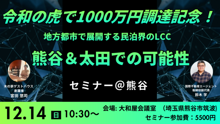 12/14 リアルセミナー「令和の虎で1000万円調達記念!地方都市で展開する民泊界のLCC~熊谷&太田での可能性」<有料>